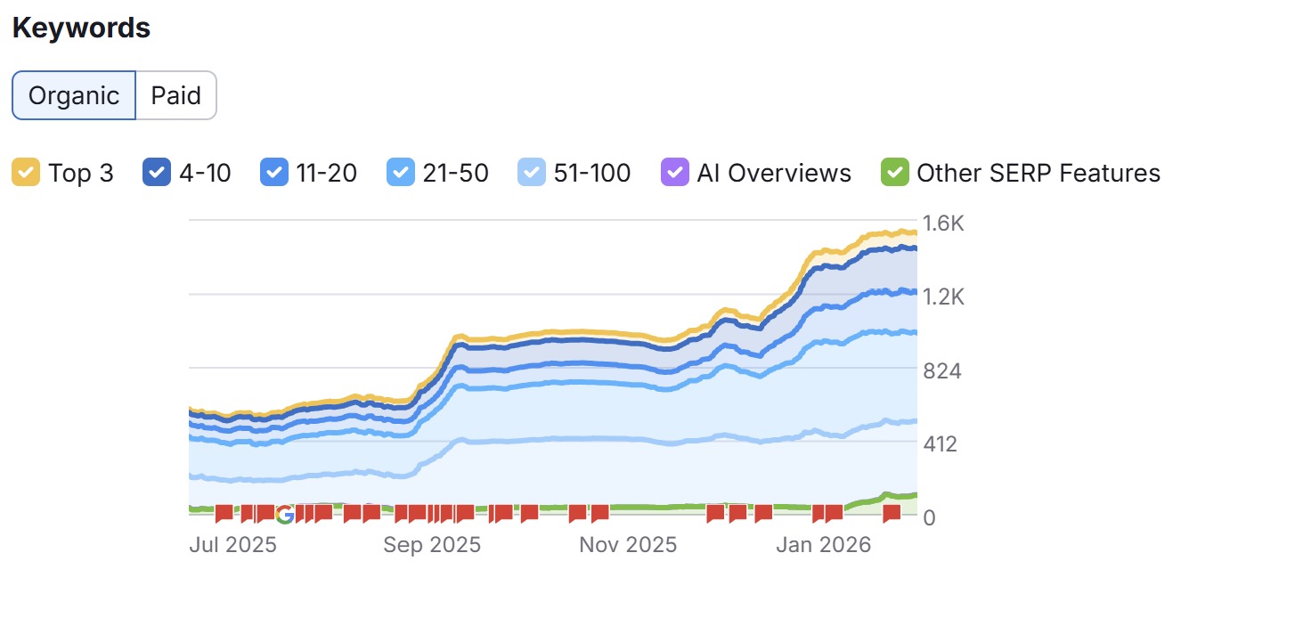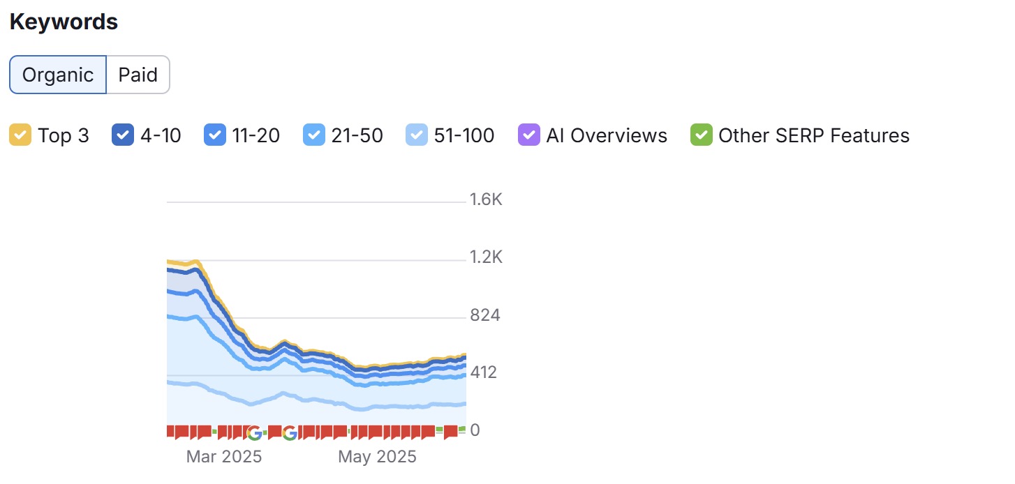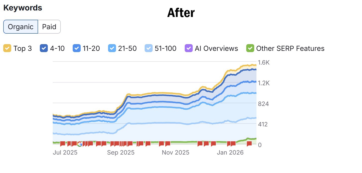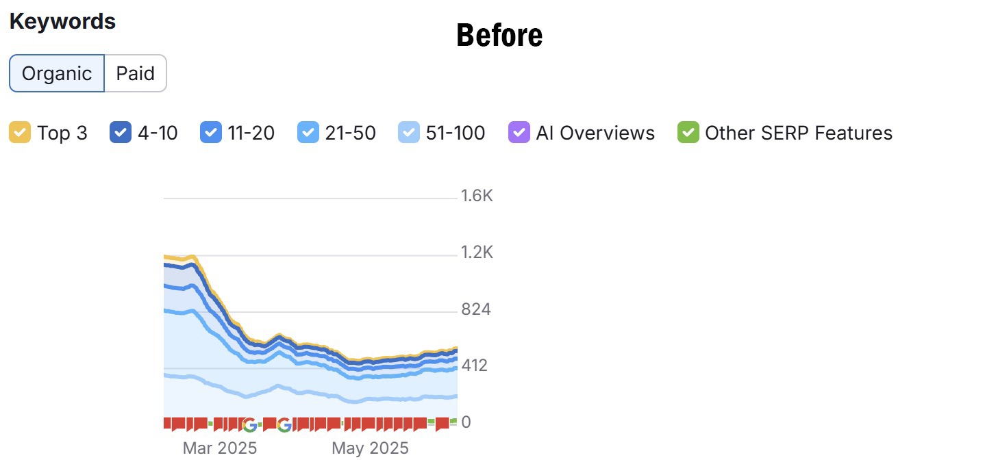 At the start of the campaign, the client’s keyword rankings were declining, with many important search terms losing visibility and dropping off the first pages. We conducted in-depth keyword research to identify high-impact opportunities, fixed keyword cannibalization issues, and realigned content to better match search intent. Through structured on-page optimization, content upgrades, and internal linking improvements, we gradually recovered lost rankings and pushed priority keywords into top positions. As shown in the current keyword charts, the site now ranks strongly for competitive keywords, delivering consistent visibility and long-term organic growth.