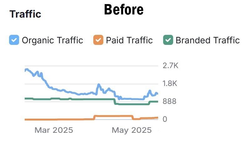 This client came to us with declining organic traffic and reduced search visibility. We started by fixing critical technical SEO issues, improving site structure, and optimizing key pages for search intent. Using a data-driven content and keyword strategy, we strengthened topical authority and improved rankings across high-value search terms. Consistent on-page optimization and strategic growth actions helped reverse the decline and drive steady organic traffic growth. Today, the website ranks at the top for competitive keywords and generates strong, sustainable organic traffic without heavy reliance on paid advertising.